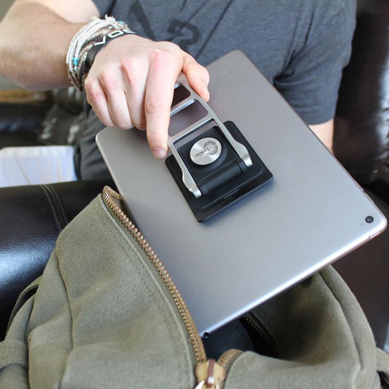 This universal tablet stand uses ultra strong Microsuction Technology to grip directly onto any iPad, eReader, or other mobile device, instantly providing standing support. Easily remove and reuse this kickstand multiple times without leaving any sticky residue on your tablet. The rotating leg seamlessly transitions your tablet from portrait to landscape mode, and the fully adjustable hinge allows a wide range of viewing angles. This portable kickstand makes watching movies, note taking, drawing, and working on your tablet simple and convenient.